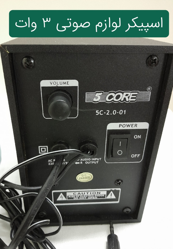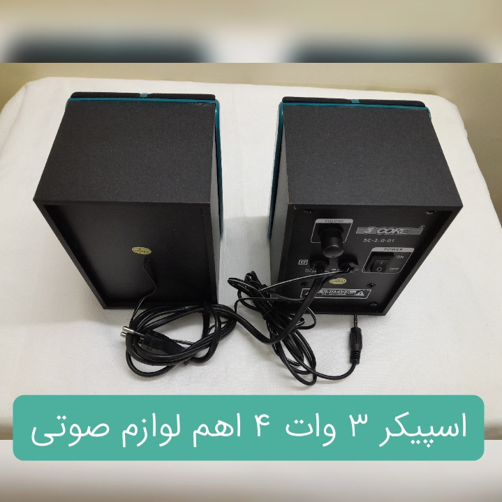 اسپیکر فایو کور لوازم صوتی .۳ وات ۴ اهم .مناسب برای کامپیوتر و لوازم صوتی مثل موبایل .جنس بدنه چوب .برق شهری . دارای ترانس داخلی و نیاز به آداپتور ندارد . کلید قطع و وصل و ولوم کم و زیاد کردن صوت.