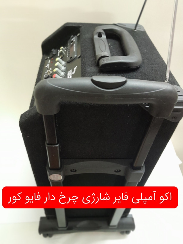 اکو آمپلی فایر شارژی چرخدار فایو کور با یک جفت میکرفون بیسیم.دارای برد فلش خور و رم و رادیو با ریموت کنترل ، دارای فیش ورودی ،دارای ولوم اکو و ولوم لاین و ولوم زیر و بم میباشد دارای فیوز محافظ برق و دارای دو اسپیکر قوی است و دسته چمدانی است : ۱